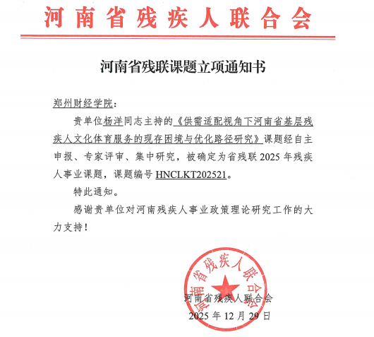 近日,河南省残疾人联合会下发课题立项通知,beat365在线体育郑州市城乡发展研究中心研究员、体育教学部副主任杨洋团队申报“供需适配视角下河南省基层残疾人文化体育服务的现存困境与优化路径研究”项目成功获批立项,这是beat365在线体育在残疾人事业研究领域取得的又一重要突破。